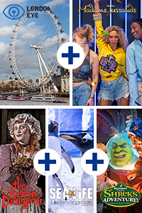Exklusivt paketerbjudande spara 60% på biljetterna: 5-in-1 Merlin Magical Pass inkluderar London Eye, Madame Tussauds, SEA LIFE London Aquarium, Shrek's Adventure! London och London Dungeon. Flexibel, ändringsbar biljett upp till 24 timmar före ditt besök!